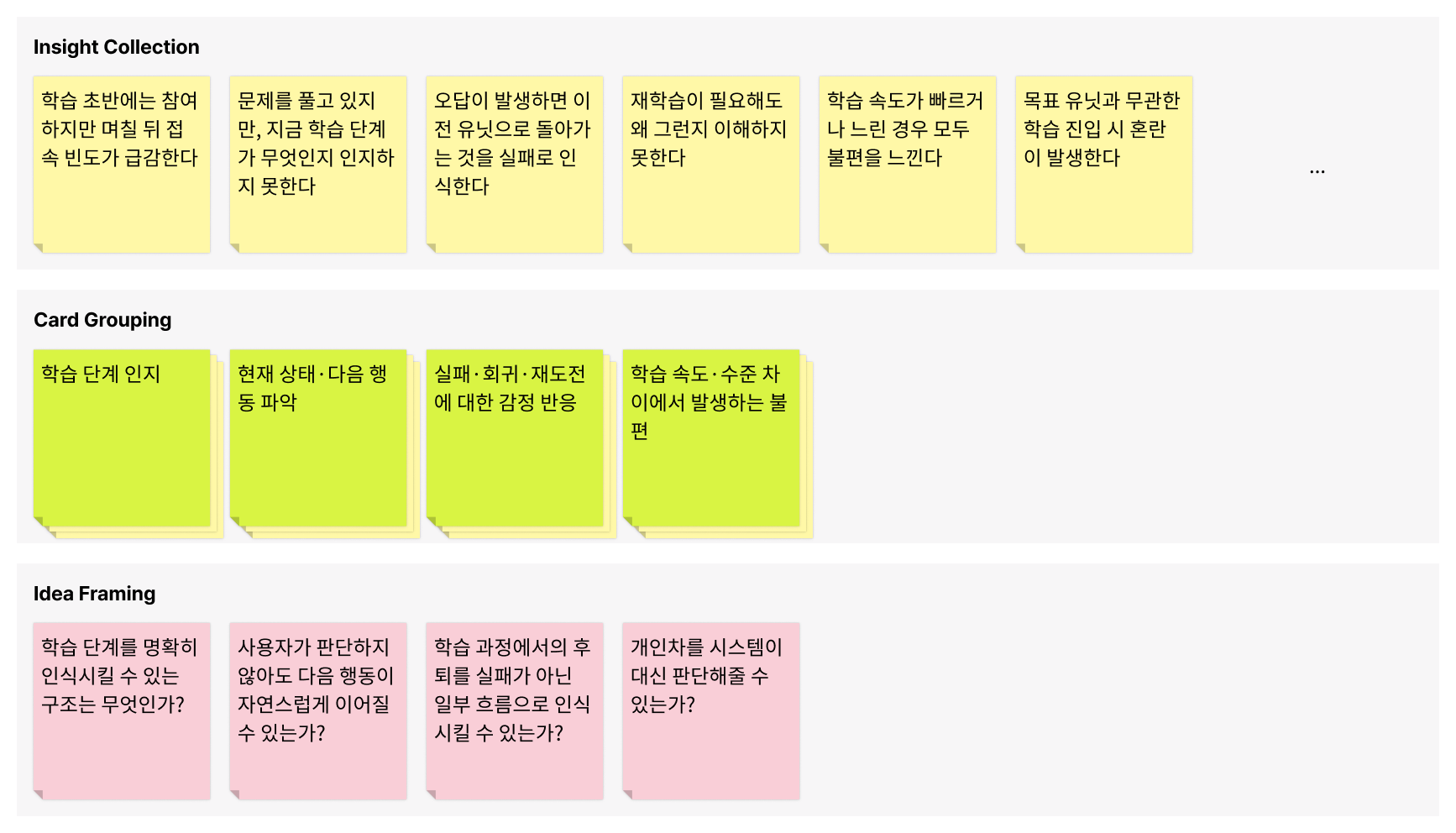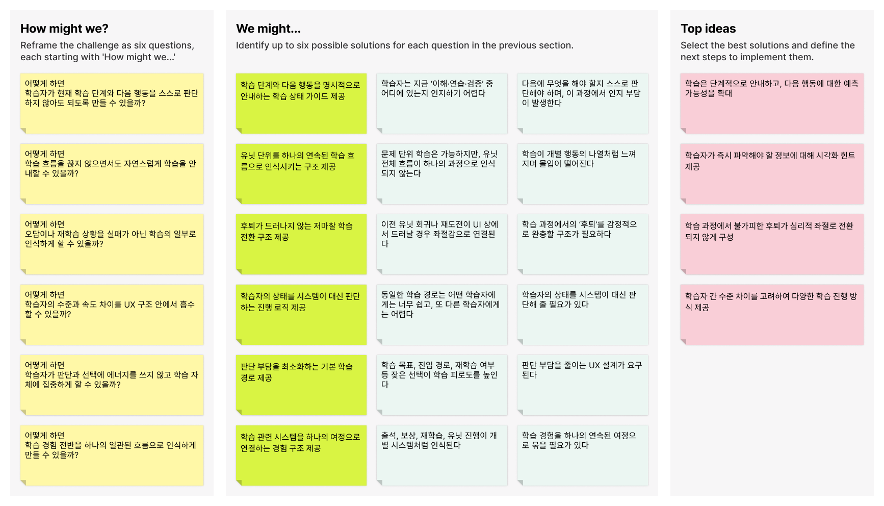 수집된 아이디어를 즉시 해결안으로 전환하지 않고, How Might We(HMW) 질문으로 재구성하여 문제를 다시 탐색했습니다. 이는 관찰된 현상을 기능 요구로 고정하기보다, 학습 경험 전반에서 UX가 개입할 수 있는 가능 영역을 넓게 정의하기 위한 접근이었습니다.