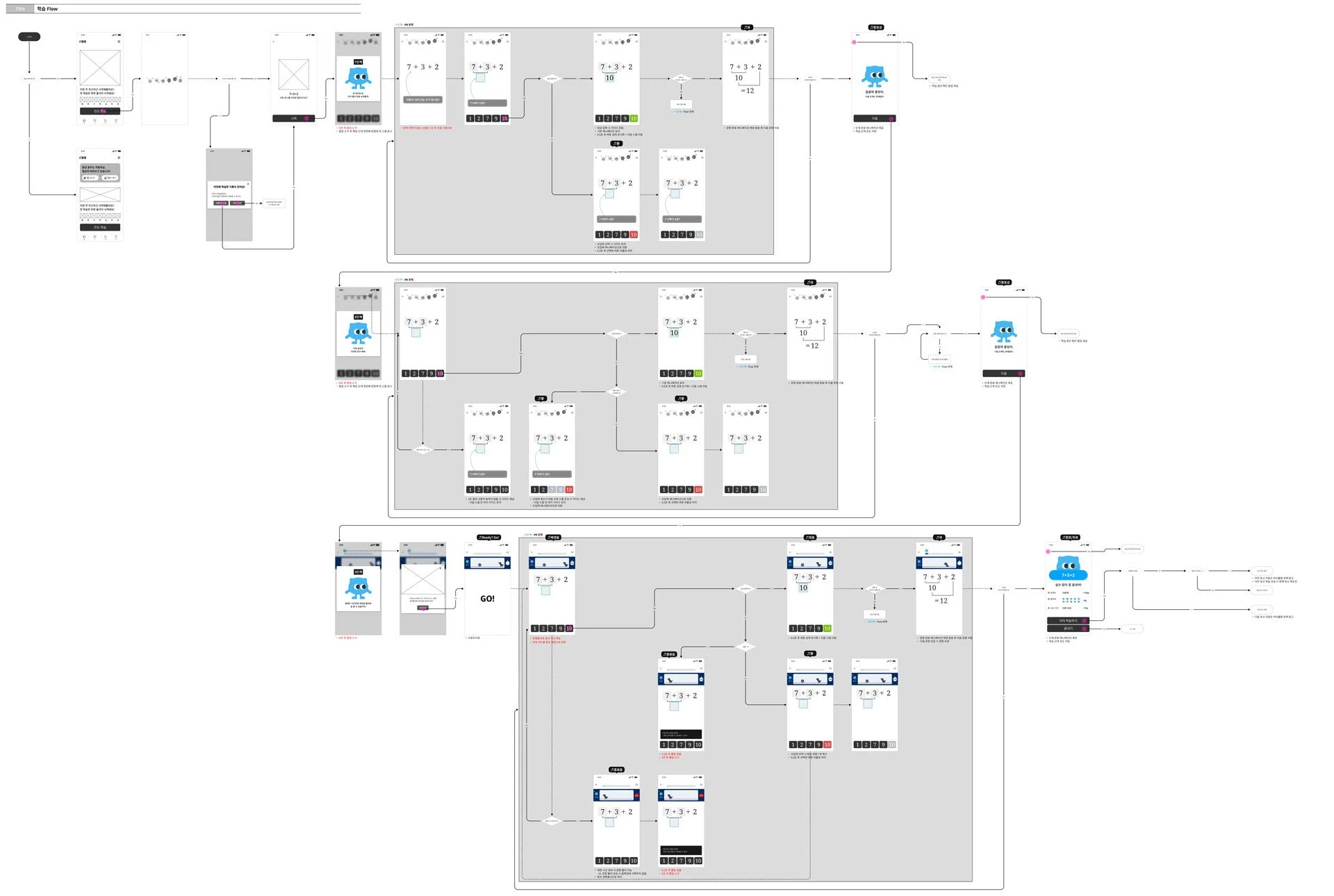 학습자가 어떤 맥락에서 어떤 행동을 하게 되는지를 중심으로 스토리보드를 구성하여, 사용자 경험의 흐름이 끊기지 않도록 설계했습니다. 이를 위해 학습 시작부터 유닛 진행, 문항 풀이, 피드백, 재학습, 학습 종료까지의 전 과정을 하나의 시나리오로 정의하고, 각 단계에서 노출되는 화면과 인터랙션을 체계적으로 정리한 화면설계서와 플로우 다이어그램을 제작했습니다. 이 문서들은 UX 의도를 명확히 전달하는 동시에, 개발·QA 단계에서 구현 기준으로 활용될 수 있도록 예외 상황과 분기 흐름까지 포함해 구성되었습니다.