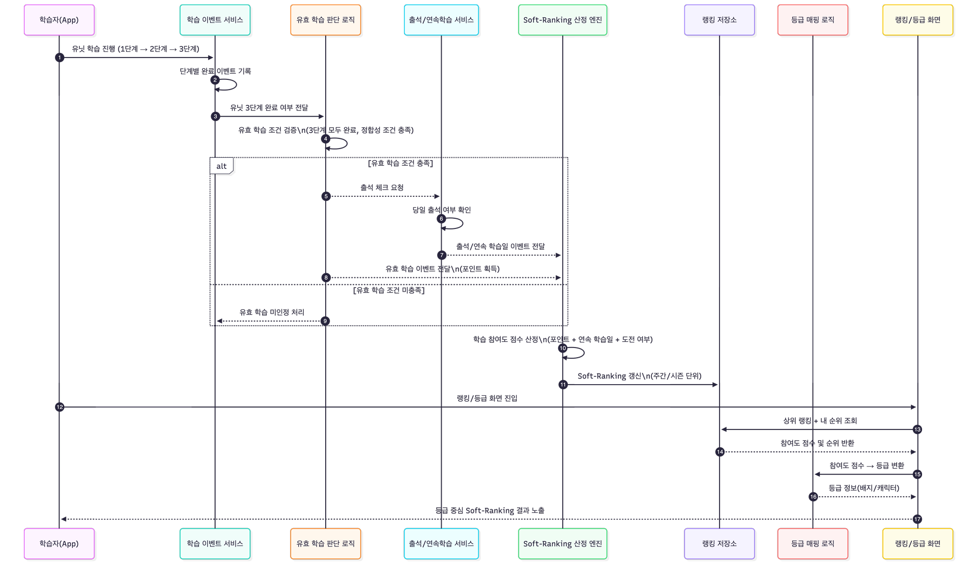 학습자가 유닛의 모든 단계를 완료했을 때, 학습 이벤트가 유효 학습으로 판단되고 출석·연속 학습을 거쳐 Soft-Ranking에 반영되는 전체 흐름을 보여줍니다. 학습 이벤트는 앱에서 발생하지만, 유효 학습 판단, 출석 처리, 랭킹 산정은 각각 분리된 서비스에서 처리되도록 설계하여 학습 경험과 보상 로직을 명확히 분리했습니다.