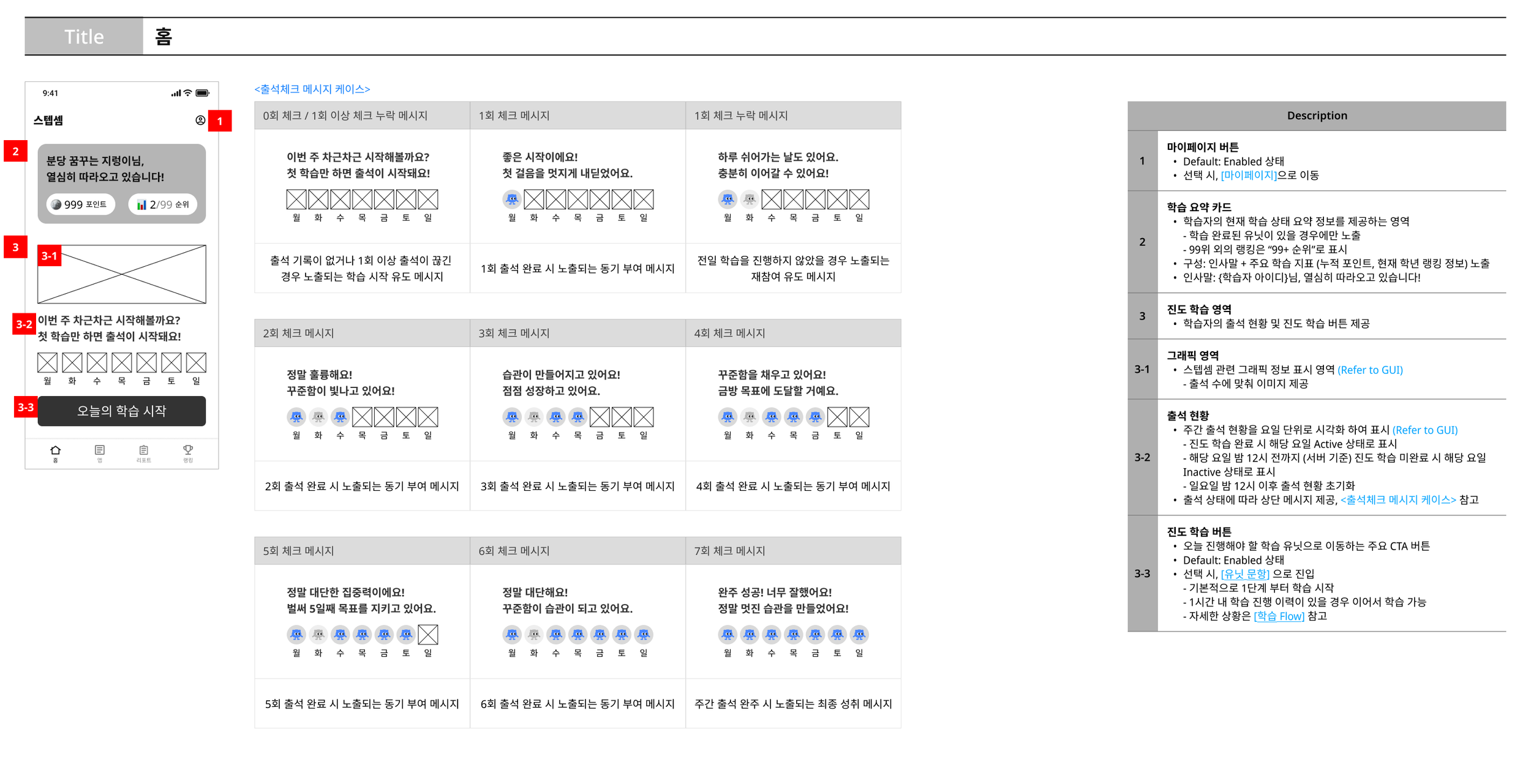 출석 일수에 따라 단계별 메시지를 제공하고, 연속 학습과 중단 후 재진입 모두에서 학습을 이어갈 수 있도록 동기 강화형 출석 UX를 설계했습니다.