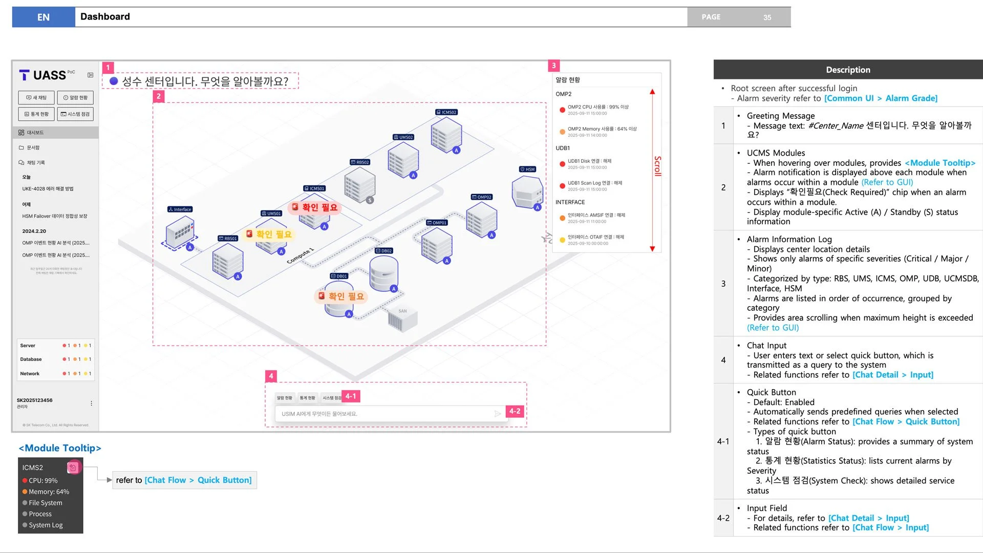 UASS의 목표는 복잡한 시스템 로그와 이벤트 데이터를 운영자가 직접 해석하지 않아도, AI가 자동으로 상황을 인지하고 대화형으로 조치 가이드를 제공하는 지능형 운영 환경을 구축하는 것입니다. 이를 통해 운영자는 수많은 모듈 상태를 한눈에 파악하고, ‘확인 → 분석 → 결과 → 보고’의 과정을 끊김 없이 수행하는 새로운 형태의 모니터링 경험을 얻게 됩니다.